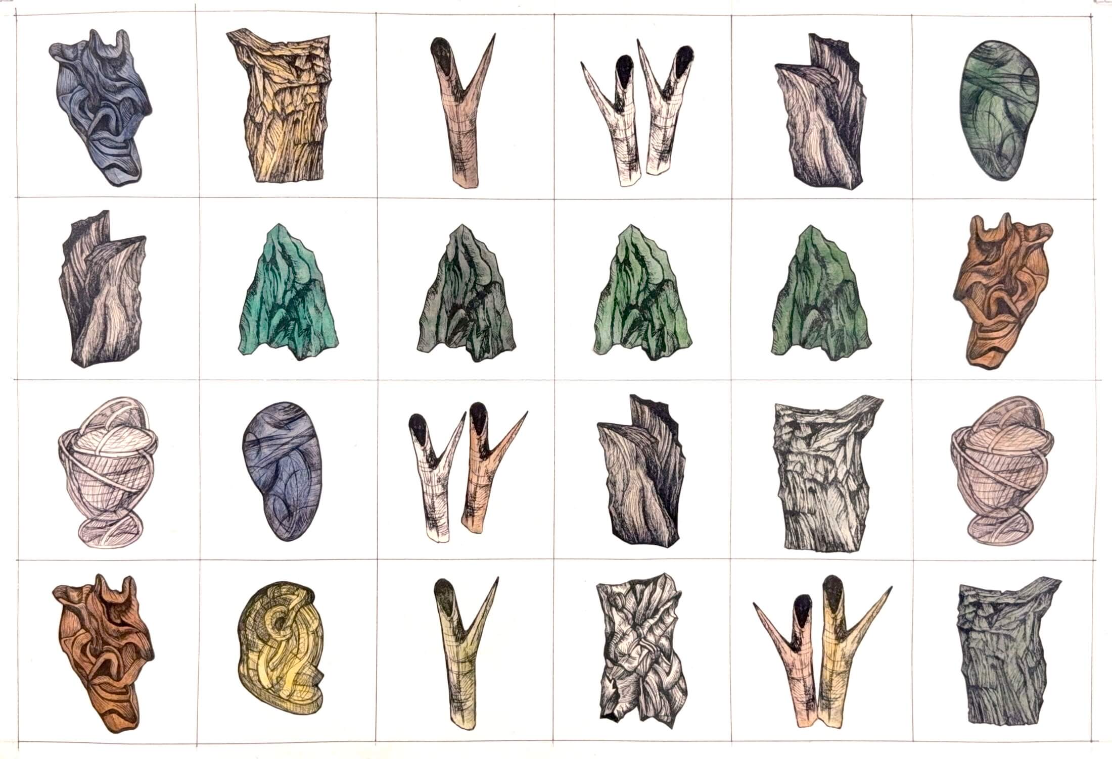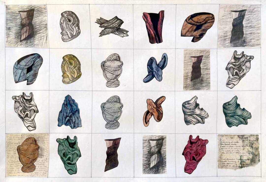 For two decades, Zea Morvitz has been drawing in small notebooks, (seen in this exhibit) often beginning with images unearthed from memory. Not interested in precise rendering, she collaborates with the form to create unique abstract images, following her curiosity and imagination. After filling dozens of notebooks with hundreds of forms, Morvitz excavated some drawings as digital images and arranged them in grids. She saw how they could be read—in a mysterious wordless way—like hieroglyphs or runes.