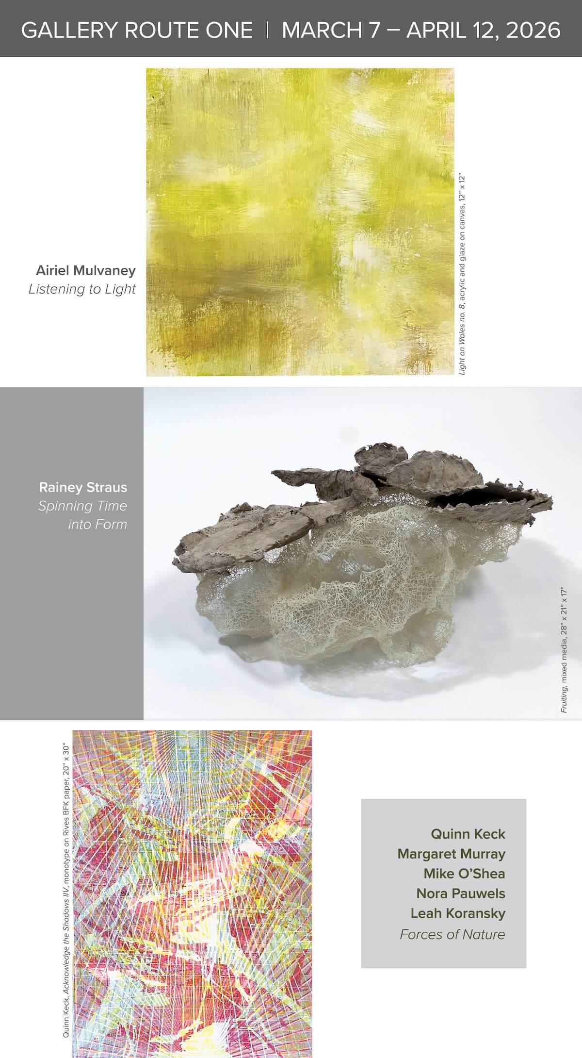 Gallery Route One in Point Reyes Station presents three new exhibitions, March 7 through April 12, 2026: AIRIEL MULVANEY: “Listening to Light” brings together two painting series: one exploring the inner light of being, and the other seeking to touch the living light of the Welsh landscape. RAINEY STRAUS: “Spinning Time into Form” invites viewers into a living field where sculptural forms and natural rhythms reveal the entangled life of human and more-than-human worlds. QUINN KECK, MARGARET MURRAY, MIKE O’SHEA, NORA PAUWELS, & LEAH KORANSKY: “Forces of nature” as curated by Megan Broughton & Kelley Berg and featuring five Bay Area printmakers share a variety of print media work that depicts literal and/or metaphorical portrayals of natural forces.