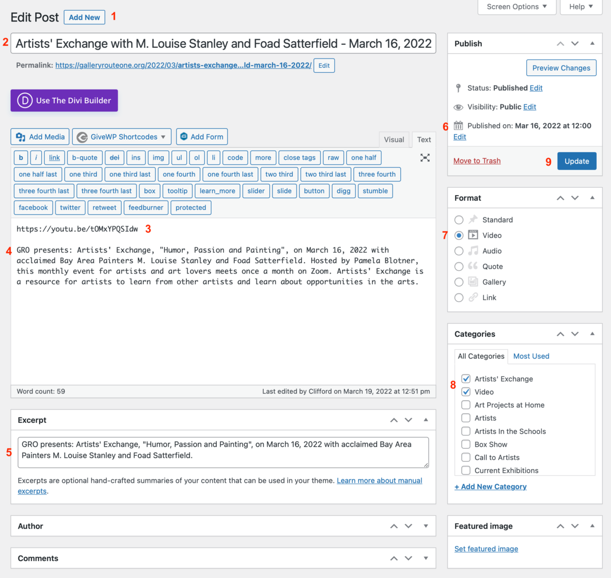 NOTE: do NOT select the Use The Divi Builder button; this special Video Post format only works in native WordPress Posts. - Enter a title in following format: Artists’ Exchange with [enter artist(s) name] – [date of video recording]