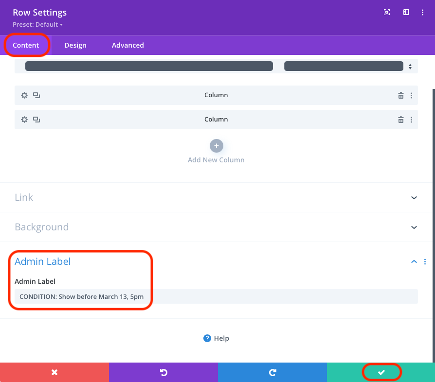 - Ensure the CONDITION is apparent to yourself and others by adjusting the Admin label on the Section, Row, or Module: After selecting OK on the CONDITION settings in step 5 above, select the Content tab on the same Section, Row, or Module. At the bottom is the Admin Label toggle. Open it and select the field then type “CONDITION: ” then paste from your clipboard. With our example the result would read: CONDITION: Show before March 13, 5pm (See FIGURE 3 below).