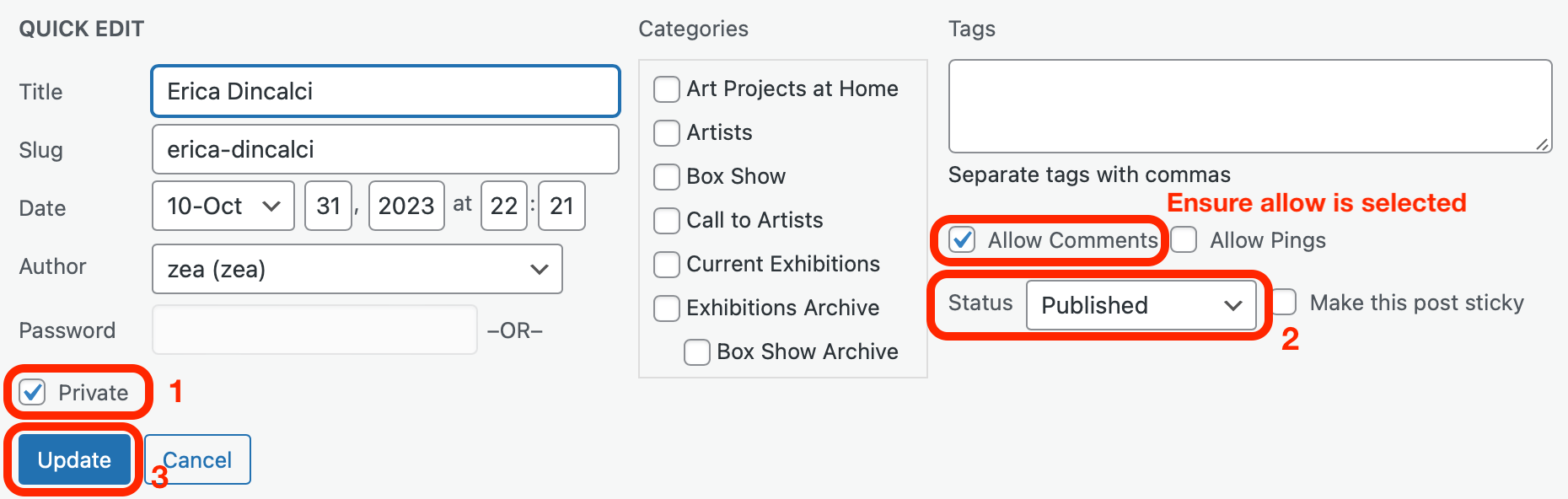 - Select Private checkbox and choose Status > Published drop menu (note that Allow Comments should be checked too)